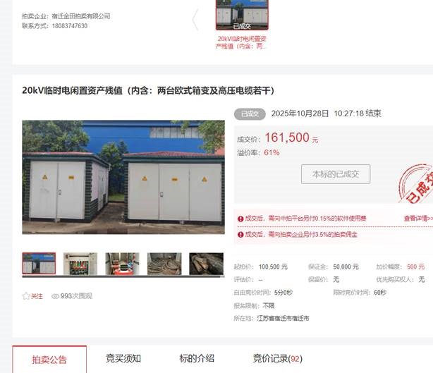 近日,城发公司青年公寓临时电项目一批闲置资产在中拍平台公开拍卖,经过27分钟的紧张激烈竞价,最终以161500元成交标的,比评估价100500元高出61000元,溢价率61%。